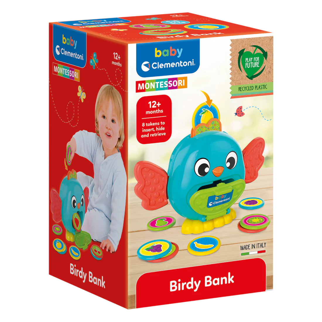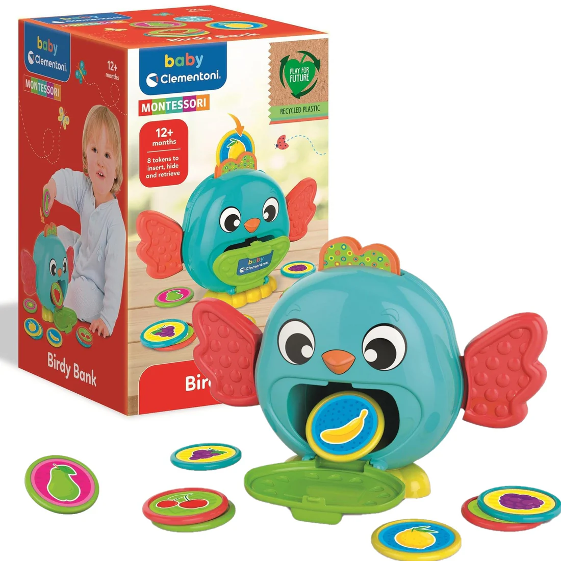 Fëmija fut monedha shumëngjyrëshe brenda zogut dhe më pas i nxjerr përsëri duke hapur kapakun në pjesën e barkut. I frymëzuar nga metoda Montessori, ky aktivitet ndihmon fëmijën të kuptojë gradualisht konceptin e qëndrueshmërisë së objekteve (object permanence) – pra që sendet ekzistojnë edhe kur nuk shihen. Një lodër edukative dhe zbavitëse që ndihmon fëmijët të mësojnë përmes zbulimit dhe lojës — perfekte për fazat e para të zhvillimit!